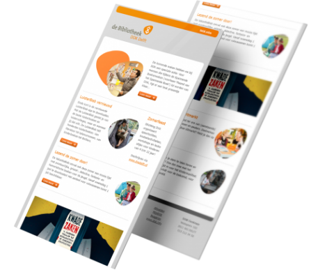 Voor de Bibliotheek in Delft hebben we een template ontwikkeld waarin het Plectrum een belangrijk stijlelement was. Via de maatwerktemplate kunnen medewerkers zelf met verschillende elementen een emailcampagne opzetten.