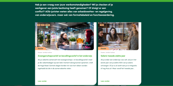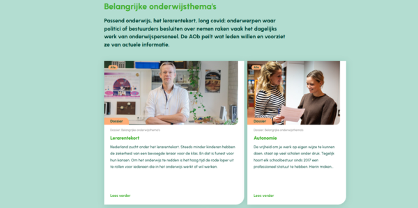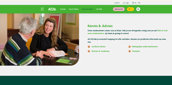 Via de AOb-site krijgen leden directe toegang tot exclusieve verhalen, zoals handige tips voor starters en juridische rubrieken. Ook kunnen leden filteren op hun onderwijssector. Afgelopen jaar is de persoonlijke MijnAOb-omgeving verder verbeterd en ook de populaire Salarischeck is daarheen verhuisd.
